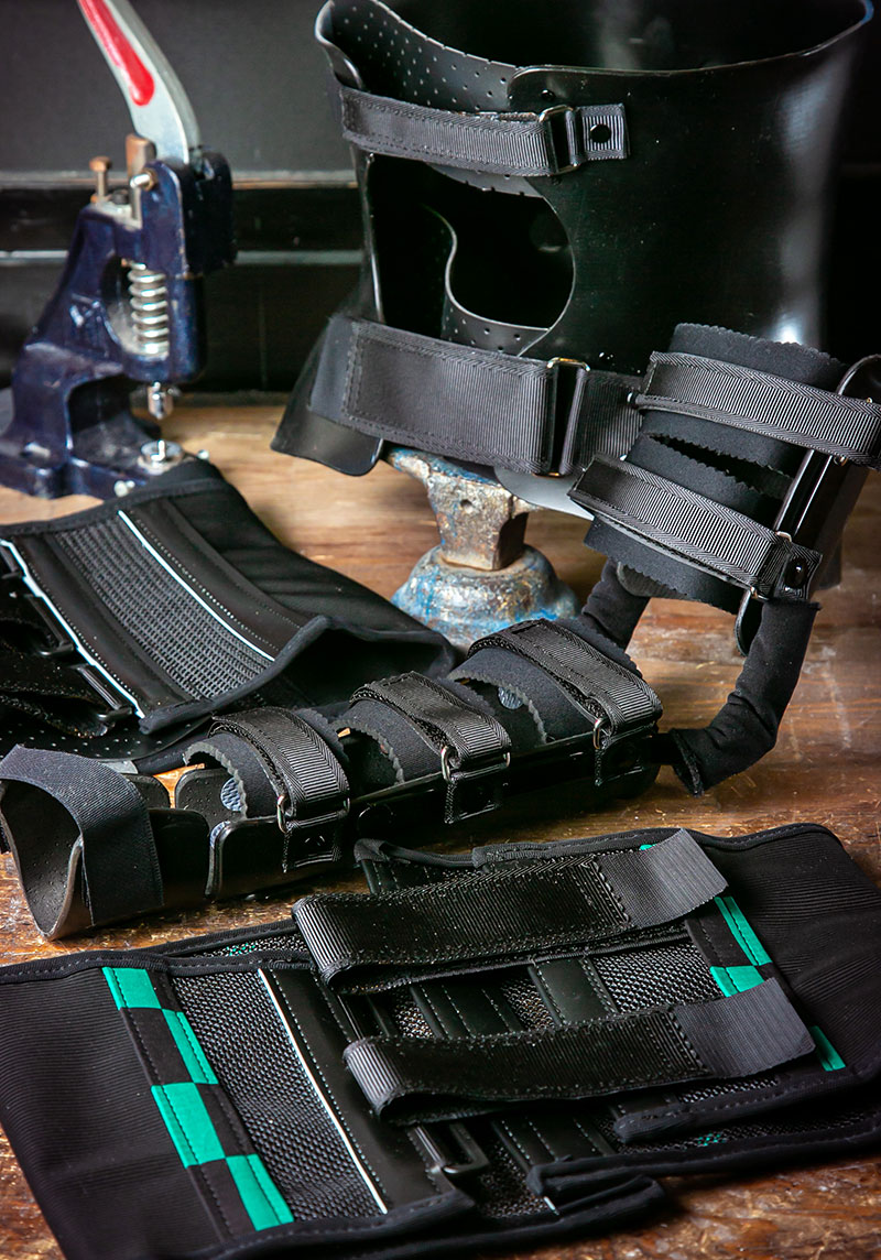 在籍するスタッフは全員、国家資格となる「義肢装具士」の資格保有者。病院へ伺い、医師の処方にしたがって、お客さまを採寸・採型し、お身体にフィットする装具を一つひとつオーダーメイドで作り上げます。コルセットやサポーター、靴の中敷、ときには義肢など、お客さまの症状や、お身体の状態によって作る装具はさまざま。装具を完成させるには、金属やプラスチック、革、生地など多種多様な材料を用い、それらを機械や工具で加工する高い技術が要求されます。